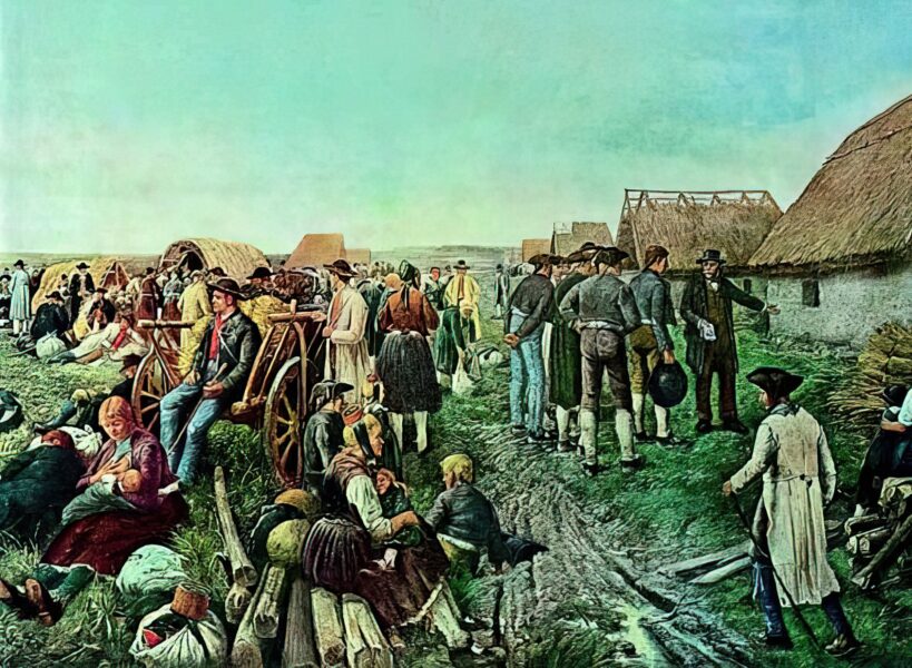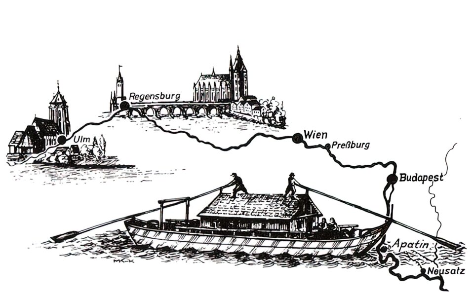 The founding of Neu Schowe occurred during the last of three periods from 1718-1737, 1744-1772 and 1782-1787 of organized large-scale migrations of Germans to areas of Austro-Hungary along the course of the Danube river and its tributaries. The general plan was for the settlers to make their way by ground transport, primarily horse-drawn wagons or on foot, to the Swabian city of Ulm and there board barges for the downstream trip on the Danube. The Danube flows through Vienna, Budapest and Belgrade on its way to the Black Sea. The migrants initially had to disembark in Vienna where they were registered, given a small stipend, food supplies and provisions for the rest of the journey, and assigned their destinations. After processing, they were reloaded onto barges for the completion of the trip.